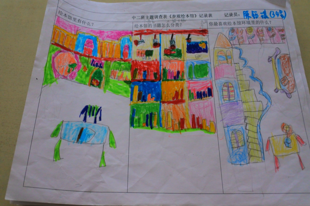 (3)幼儿真参与:在家长的配合下,孩子们走出校园,走出电脑、书本,走进图书馆,亲身体验、参观,调查、记录,丰富了经验,拓展了视野。