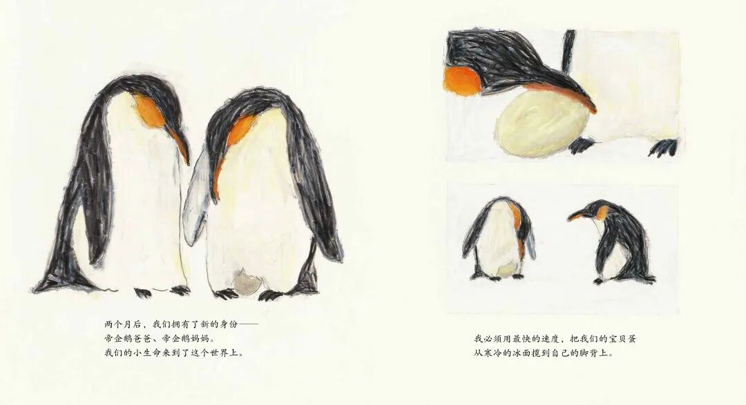 这个故事以第一人称的视角,带大家来到冰天雪地的南极,跟随着帝企鹅爸爸一起,在白色大地上看着帝企鹅宝宝破壳而出,蹒跚学步,从毛茸茸的小家伙长成神气的帝企鹅,像父母一样,遨游在蓝色的海洋。