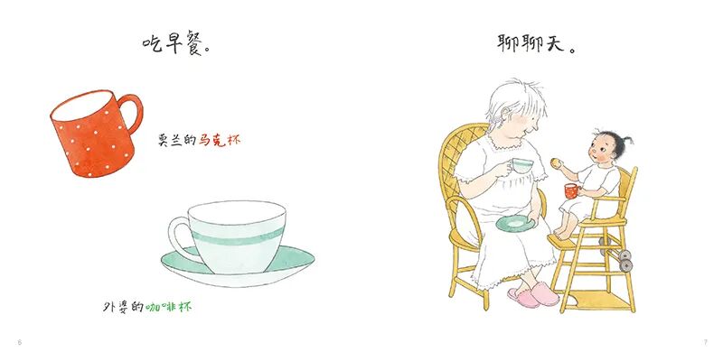 住在外婆家,一起聊天。读故事书,一起做饭。猜猜看,哪个是莫兰的牙刷?哪个是外婆的牙刷……