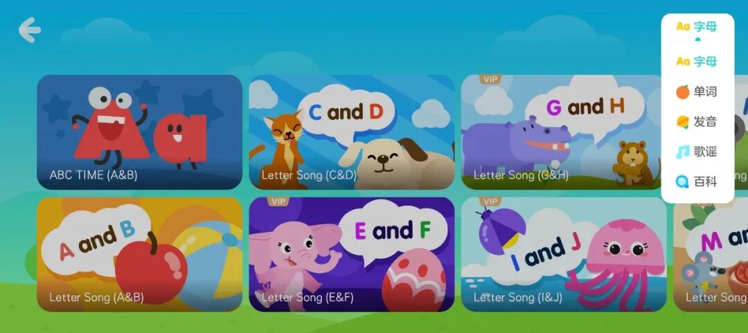 教学方式主要是从字母开始延伸到一儿童启蒙早教动画片些相关单词,没有AI互动,也没有老师教学。点击教学就是听歌曲,单词记忆,听力练习、拼写练习,玩游戏,五个部分来反复巩固,加强单词的记忆。